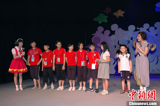 7月7日晚,來自臺灣的小朋友還收到了一份“棒棒TV”送出的特別禮物。參加“2010·陽光海峽——兩岸快樂小天使活動營”的小營員們在福建人民藝術劇院觀看由福建當地節目“棒棒TV”全體主持人首次獻演的兒童劇《我和我的影子》。曾偉 攝