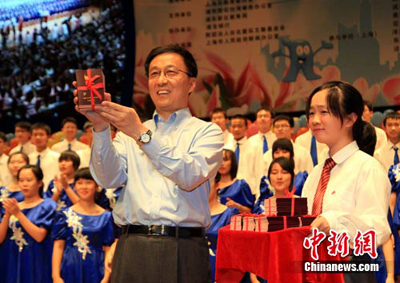 7月19日,上海市市長韓正在上海出席“2010年滬臺青少年走進世博千人夏令營”開營儀式,并向滬臺學生贈送“世博護照”。參加此次夏令營的滬臺高中各16所,兩岸學生將攜手參觀世博會、參加學生論壇、攝影比賽等活動。中新社發 潘索菲 攝