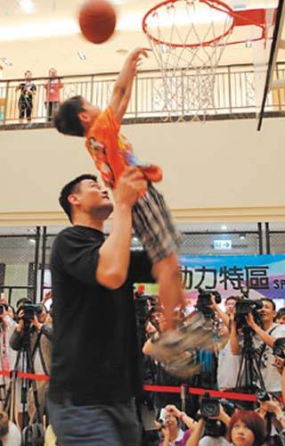 姚明抱起小男生灌籃,全場(chǎng)歡呼聲不斷。圖片來(lái)源:臺(tái)灣《聯(lián)合報(bào)》