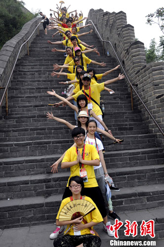 7月27日,2010年海外華裔及港澳臺地區青少年“中國尋根之旅”夏令營部分營員來到長城游覽。圖為來自港澳臺的部分青少年興奮地在長城上擺起“千手觀音”的造型留念。 劉震 攝