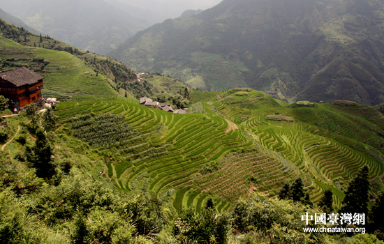 中國臺灣網8月21日桂林消息 位于廣西龍勝各族自治縣的龍脊山,因擁有嫵媚瀟灑曲線的梯田而聞名于世。登上龍脊山,參加“情系八桂——兩岸文化聯誼行”的兩岸嘉賓在欣賞佳禾吐翠,綠浪排排的美景同時,也不由得感嘆這里世世代代瑤族人民的智慧與勤勞。
