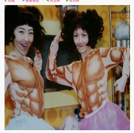 今天上午,大S在微博上表示,不知不覺自己微博人數破200萬,她決定貼張妹妹小S銷魂泳裝照慶祝一下。果然1張小S的照片出現在了大S的微博中,照片中的小S穿著連身泳裝,一臉稚氣的模樣,卻裝出嬌媚的神情,還雙手舉著隨風飛揚的白色披巾。此外,大S還預告將會放上一張“血脈噴張”的照片,結果過不久網友就看到她在微博上貼了一張名為“金剛芭比”的照片。這張照片是她和小S主持《娛樂百分百》時期爆笑裝扮,兩人都穿上“肌肉服”、畫上假胡渣、戴上爆炸假發,搞笑功力十足。