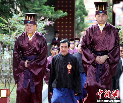 9月28日是中國偉大的思想家、教育家、儒家學派的創始人孔子誕辰2560周年。圖為臺灣地區領導人馬英九(中)當日清早自臺北孔廟中門進入孔廟,參加祭孔釋奠典禮。 中新社記者 陳立宇 攝
