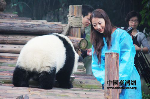 中國臺灣網10月20日成都消息 新近當選“熊貓守護使”的臺大美女模特王郁文在走馬上任之初便活動不斷。19日上午,王郁文出現在成都大熊貓繁育研究基地內部,與熊貓來了一次“親密接觸”。