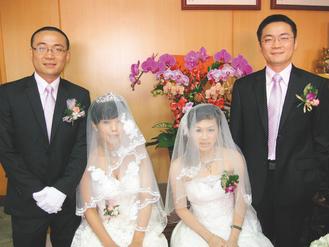 臺南縣沈威廷(左)、沈威志(右)雙胞胎兄弟昨天同日娶妻,親友們包一個紅包喝兩對新人喜酒,紛祝兩人明年都生“雙生”。