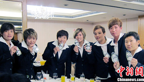 11月29日晚,臺灣有關(guān)方面在臺北為參加2010年第16屆廣州亞運會的中華臺北體育代表團舉行慶功餐會。會上,該次亞運上的中華臺北金銀銅牌全體得主分別獲贈由臺灣大洋金幣公司提供的廣州亞運主題金銀紀(jì)念幣和熊貓團團圓圓紀(jì)念銀幣,共217枚總值80萬多元新臺幣。圖為運動員在展示受贈的紀(jì)念幣。