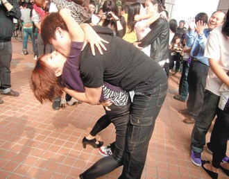 學生林俊瑜、胡秀慧接吻招式百出,吻到劈腿、下腰。圖片來源:臺灣聯合報