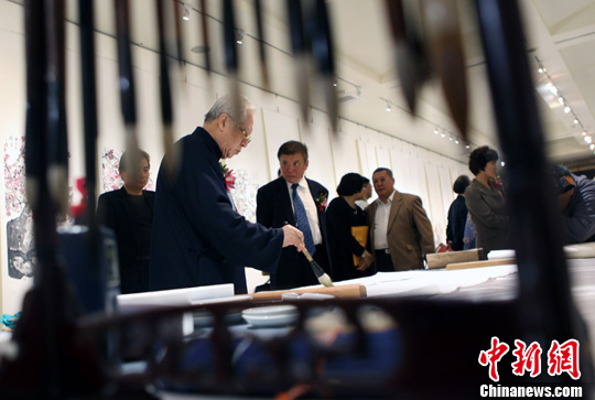 12月14日,大陸著名的開明畫院臺(tái)北書畫展在臺(tái)北開幕。兩岸畫家還當(dāng)場揮毫,進(jìn)行了一場別開生面的中國書畫筆會(huì)。圖為臺(tái)灣著名畫家、中研院嶺南美術(shù)館榮譽(yù)館長歐豪年在筆會(huì)上作畫。中新社記者 黃少華 攝