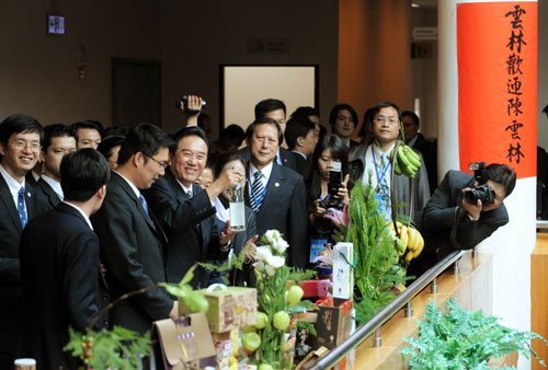 大陸海協會長陳云林(前左3)26日率團到云林科技大學,與當地農、漁業代表舉行座談會。圖片來源:“中央社”