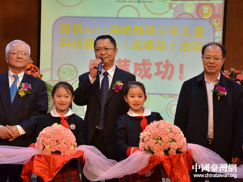 中國臺灣網3月18日成都消息 3月18日上午9時,“2011海峽兩岸少年兒童科技嘉年華(成都站)”活動在成都市龍江路小學(南區)舉行了熱烈的開營儀式。臺灣元智大學科學教育研究中心主任王仲淳博士、臺北市萬華社區大學校長李端端、臺灣力翰文教管理顧問公司執行長吳志榮,成都市臺辦副主任朱隆欽、市教育局副局長崔昌宏等出席了開營儀式。