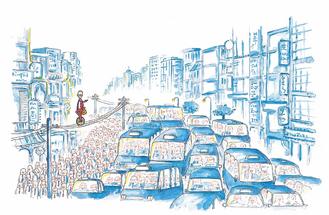 《在這個世界里的自我角落》,畫的是一名在電線桿上騎車的人,就算行為怪異也有屬于自己的生活方式 。這幅畫作在臺北完成。