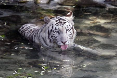 高雄市壽山動物園27日讓白老虎“歡樂”體驗展場。她將身軀泡在清涼池子里,還啜飲了幾口水,感受酷熱天泡冷水澡的沁涼。圖片來自臺灣“中央社”