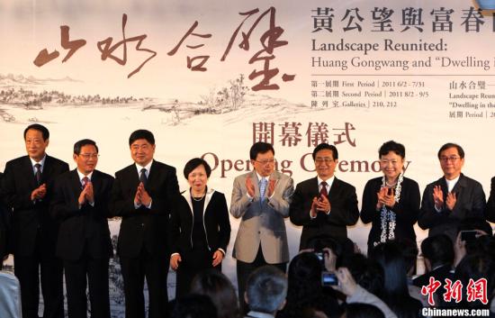 資料圖:“山水合璧—黃公望與富春山居圖特展”6月1日上午在臺北故宮舉行開幕儀式。浙江省委書記趙洪祝、國家文物局局長單霽翔、臺灣中華文化總會會長劉兆玄、臺北故宮博物院院長周功鑫等出席。中新社發 趙振清 攝