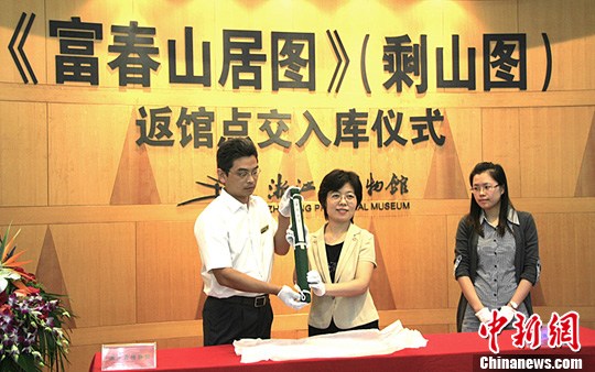 9月14日上午10時(shí),浙江省博物館在孤山館區(qū)報(bào)告廳舉行《富春山居圖》(剩山圖)返館點(diǎn)交入庫(kù)儀式。中新社發(fā) 江耘 攝
