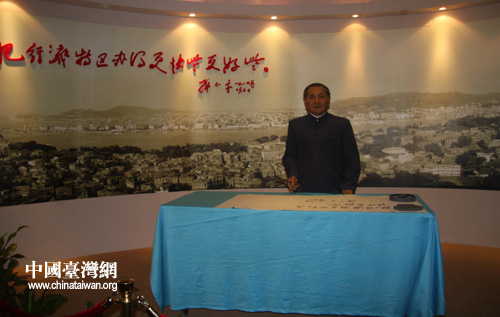 在鄧小平同志視察廈門陳列室里,鄧小平題字的塑像吸引了眾多記者的目光。這個立體呈現的場景,重現了小平同志1984年視察湖里并題詞時,現場使用過的桌子、臺布、沙發及窗簾布等。塑像背后,正是當年小平同志的題詞:“把經濟特區辦是更快些更好些。”(中國臺灣網 趙靜 攝)