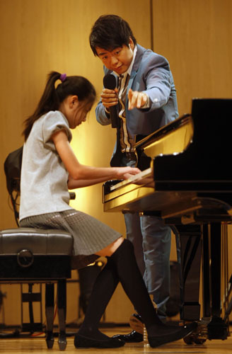 鋼琴家郎朗(右)27日在高雄與近千名學生座談,分享音樂經(jīng)驗,并現(xiàn)場指導音樂班學生,幽默逗趣的指導方式,屢獲學子笑聲與掌聲。 圖片來源:“中央社”