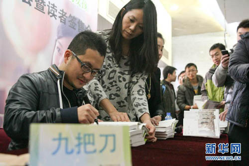 1月11日,臺灣知名網絡文學作家九把刀(藝名)在北京西單圖書大廈為讀者簽名。當日,《那些年,我們一起追的女孩》新書簽售活動在北京舉行。作者九把刀本名柯景騰,被譽為臺灣網絡文學的領軍人物。其自傳體小說《那些年,我們一起追的女孩》講述了作者九把刀的一段青春往事。根據小說改編、由九把刀親任導演的同名電影于1月6日登陸內地市場,受到觀眾熱捧。新華社記者 張帆 攝
