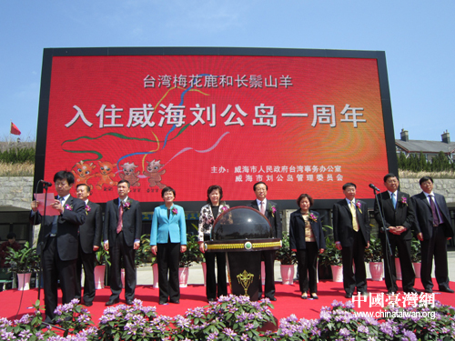 4月16日上午,臺灣梅花鹿和長鬃山羊入住一周年紀念活動現(xiàn)場。(圖片來源:威海市臺辦)