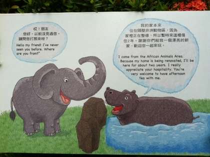 該告示牌以“大象和河馬的對話”為主題,告知游客河馬暫時和大象成為鄰居,內文的兩段對話如下: