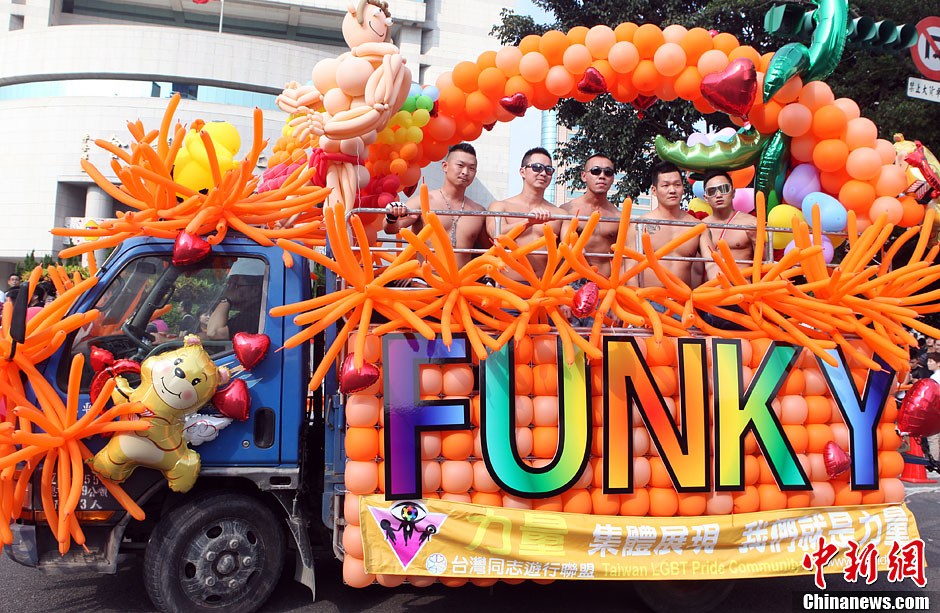 10月26日,號(hào)稱亞洲最大規(guī)模的“同志”(同性戀者)大游行下午在臺(tái)北登場(chǎng),數(shù)千人走上街頭,精心打扮爭(zhēng)奇斗艷。圖為游行前“同志們”在臺(tái)北市政府廣場(chǎng)前集結(jié)。陳立宇 攝