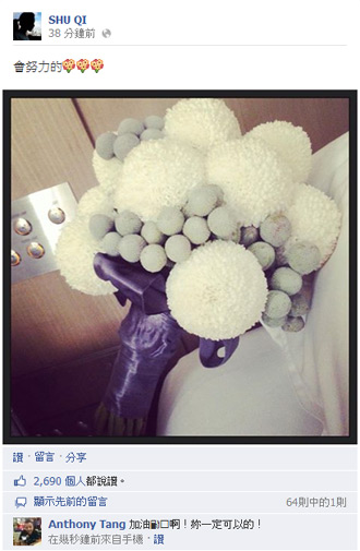 昨晚舒淇步出婚禮派對時,臉上帶著甜蜜笑意說“很開心,看到好朋友嫁出去很開心”,言語透露出舒淇與張震太太莊雯如也是好朋友。舒淇今早還在facebook上曬出捧花照片,并直喊“會努力的”,獲得不少網(wǎng)友按贊,回應(yīng)她說“幸福在妳身邊”。