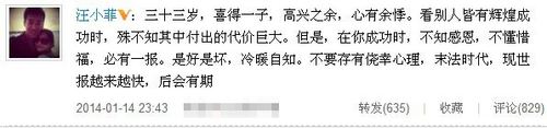 1月14日晚,汪小菲似有感而發(fā)在微博寫下文字:“三十三歲,喜得一子,高興之余,心有余悸。看別人皆有輝煌成功時,殊不知其中付出的代價巨大。但是,在你成功時,不知感恩,不懂惜福,必有一報。是好是壞,冷暖自知。不要存有僥幸心理,末法時代,現(xiàn)世報越來越快,后會有期。”網(wǎng)友在猜測其微博深意時,也發(fā)現(xiàn)他最開始的兩句話“三十三歲,喜得一子”疑泄露了大S所懷為男孩。