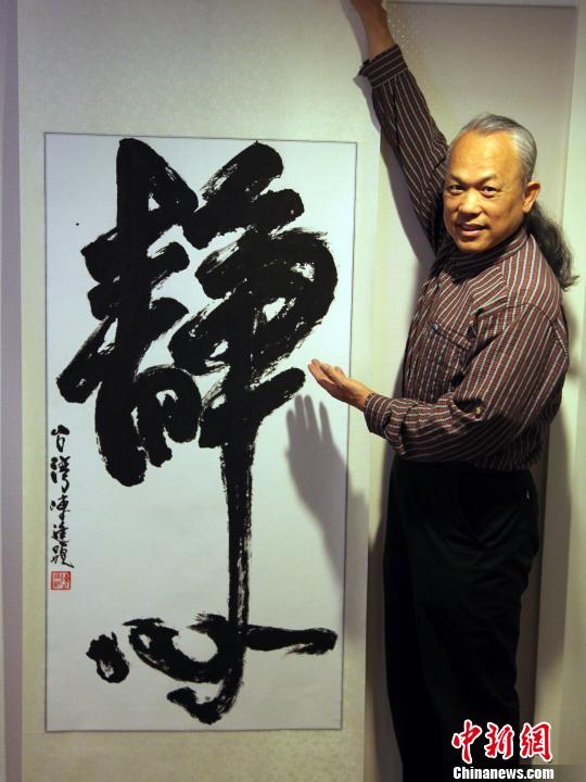 圖為2014新北市美術家聯展。臺灣知名藝文家陳逢顯與他參展的書法作品“靜心”。 陳立宇 攝
