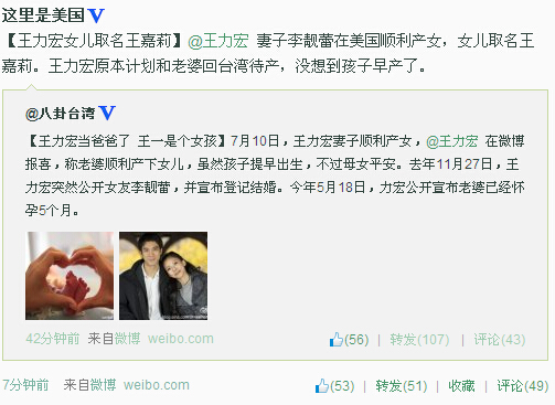 據(jù)臺媒報道,王力宏 妻子李靚蕾昨天在美國順利產(chǎn)女,女兒取名為王嘉莉。王力宏原本計劃和老婆回臺灣待產(chǎn),沒想到孩子早產(chǎn)了1月?lián)ぃ趿耆膛惝a(chǎn),公布喜訊后還開心地表示,從小就希望能擁有自己的小孩的夢想如今終于實現(xiàn)了。