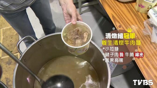 小拉面,過水汆燙20秒馬上撈起,再放進,帶筋脆彈腱子肉,和口感綿密的牛腩,最后琳上蘋果、西芹、白蘿卜、洋蔥,熬煮的蔬果高湯清燉組第一名,主打清爽口感。臺北牛肉面節清燉組冠軍業者高呼:“冠軍牛肉面在這。”