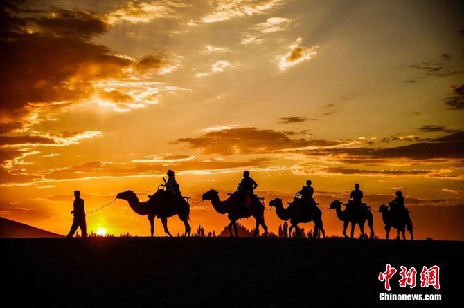 原標題:敦煌出現火燒云 晚霞駝影相映成趣
