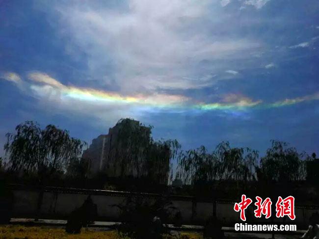 8月5日中午,包括省會蘭州在內(nèi)的甘肅多地網(wǎng)友紛紛通過微博、微信朋友圈等曬出當(dāng)日中午拍攝到的一條色彩斑斕的云朵倒掛在天邊的景象圖片。令網(wǎng)友感到不解的是,當(dāng)日天空出現(xiàn)彩云的多地并未出現(xiàn)降雨,晴空萬里的條件下出現(xiàn)絢麗彩虹的情況似乎比較罕見。李娣娣 攝