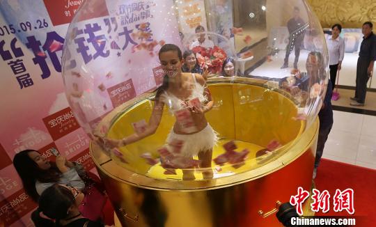 直徑3米的水晶球內堆滿人民幣,鼓風機強勁風力卷來,密密麻麻人民幣形成的“颶風”在水晶內旋轉,人們在球內掀起瘋搶大戰,搶多者得……23日,南京市中心一珠寶商家舉辦“搶錢大賽”預賽,引發路人關注尖叫。