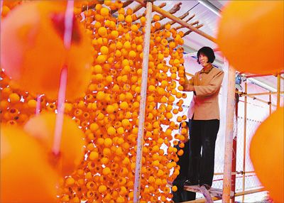 10月25日,山東省沂源縣東里鎮(zhèn)鄭家旺村的農(nóng)民在對柿子進(jìn)行刮皮加工。霜降過后,沂源縣的5萬余畝柿子豐收,加工成柿餅后,出口韓國、日本等國家,成為當(dāng)?shù)剞r(nóng)民增收的特色產(chǎn)業(yè)。