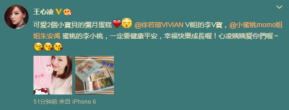 王心凌在微博寫道:“可愛2個小寶貝的彌月(滿月)蛋糕,徐若瑄的李V寶,朱安禹的李小桃,一定要健康平安,幸福快樂成長喔!心凌姨姨愛你們喔。”