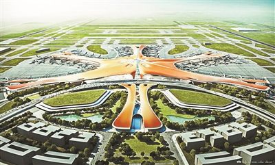 近日,北京大興國際機場航站樓樁基礎開始施工,標志著機場主體工程開工建設。整個工程預計在2019年建成并投入使用。新機場地基深達40米,為五指廊放射狀“鳳凰”,本期工程站坪機位數為150個,旅客到最遠登機口的步行距離約為630米,只需要8分鐘,僅為首都機場T3航站樓所需26分鐘的1/3。另外,圍繞新機場還將打造600平方公里的新航城。