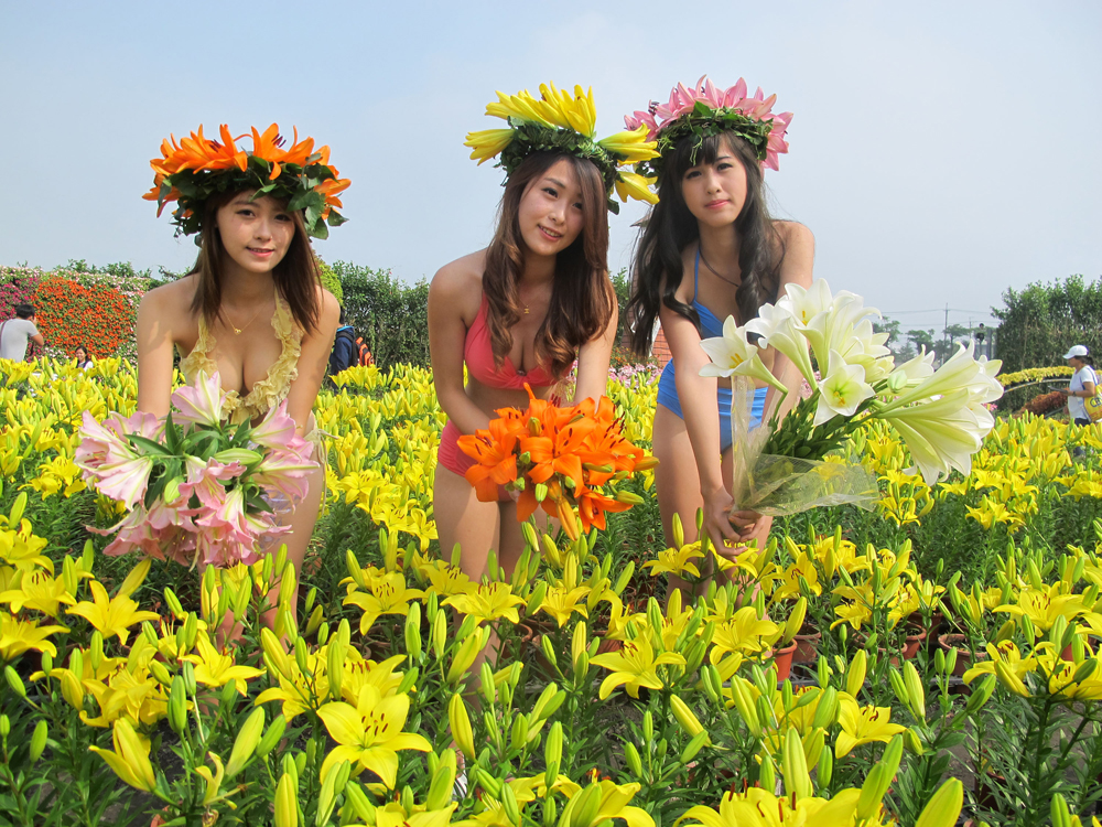 臺中后里區(qū)中社觀光花市自荷蘭引進(jìn)50多種百合花球莖,利用低溫技術(shù),讓百合花提前一個月開花,29日開幕式上,請來比堅(jiān)尼辣妹與百合花爭艷。圖片來源:臺灣“中央社”