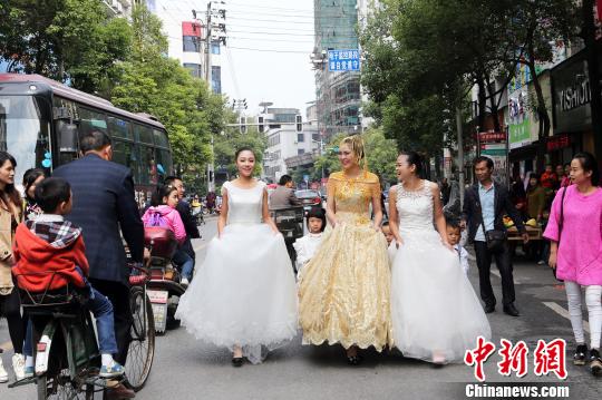11月4日,在湖南省臨武縣解放路,一模特身穿黃金婚紗行走街頭,引來眾多民眾駐足圍觀。該婚紗價值500余萬元,由鳳冠、霞帔、婚紗組成,共耗費9.999千克萬足金,純度高達999.9‰,由30余位頂級珠寶匠師耗時半年之久精制而成。