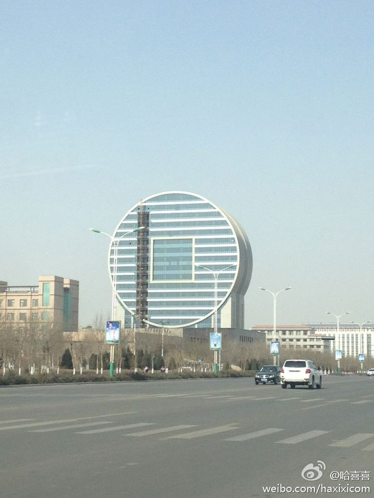 2015年11月23日,寧夏回族自治區(qū)平羅縣民族大街旁,有一幢獨(dú)特造型的大樓很吸引人的眼球。大廈兩面呈立面圓形結(jié)構(gòu),造型酷似古代使用的“銅錢”,但也有路過市民說,這棟大樓的造型很像大鼓。(圖片來自網(wǎng)絡(luò))