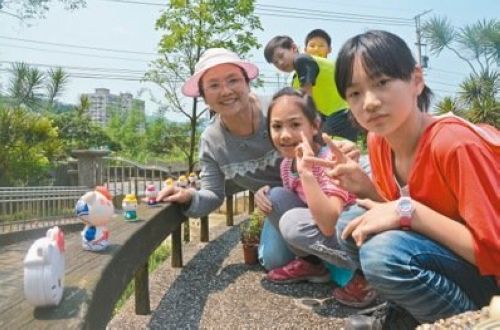 學生家長游顏綺(左一)把家中搜集十多年的公仔玩具全部搬到尚仁小學,一個一個地黏上去,小朋友都說很好看。來源:臺灣《聯合報》