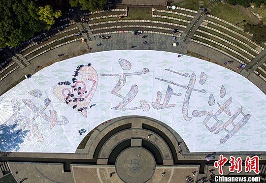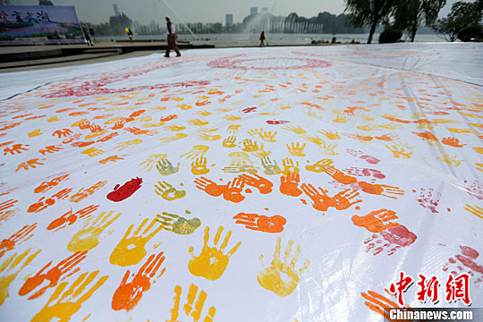 5月19日是中國旅游日,一幅近2000平米的巨幅扇面出現(xiàn)在南京玄武湖蓮花廣場上,通過江蘇廣播FM997金陵之聲征集而來的一百多名志愿者按上彩色手印,用特殊的方式倡議民眾文明旅游,爭做文明旅游人。中新社記者 泱波 攝