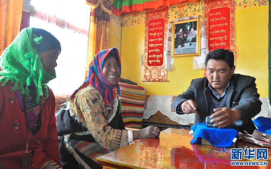 西藏日喀則市薩嘎縣達吉嶺鄉薩嘎村牧民在助農取款服務點刷卡取款(2014年4月27日攝)。新華社記者 普布扎西 攝