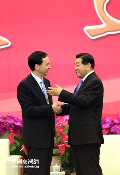 中共中央政治局常委、全國政協主席賈慶林與中國國民黨副主席朱立倫親切握手。(中國臺灣網 鐘寶華 攝)