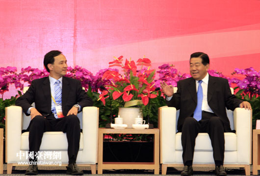 中共中央政治局常委、全國政協主席賈慶林會見中國國民黨副主席朱立倫。(中國臺灣網 鐘寶華 攝)