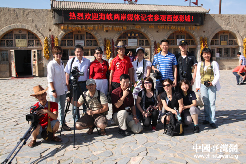 7月25日,海峽兩岸的記者在銀川鎮北堡西部影城合影留念。(中國臺灣網 楊永青 攝)