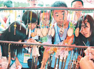 汶川地震災區中學生26日到南投地區參觀,921地震后居民學習手工藝創作,最吸引學生的注意。(圖片來源:臺灣《聯合報》)