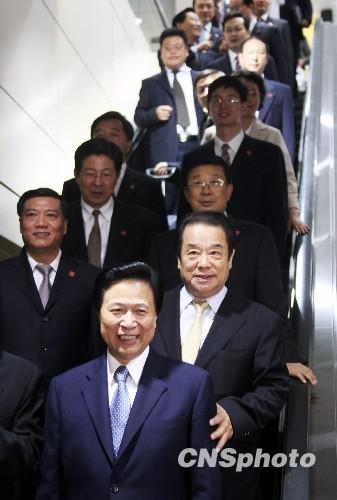 11月9日下午,中共江蘇省委書記梁保華率代表團(tuán)乘飛機(jī)從南京抵達(dá)桃園機(jī)場(chǎng),展開訪臺(tái)行程。圖為梁保華(左二)在中國(guó)國(guó)民黨中央副秘書長(zhǎng)張榮恭(左一)、臺(tái)灣工業(yè)總會(huì)理事長(zhǎng)陳武雄(左三)等陪同下步出機(jī)場(chǎng)。 中新社發(fā) 黃少華 攝