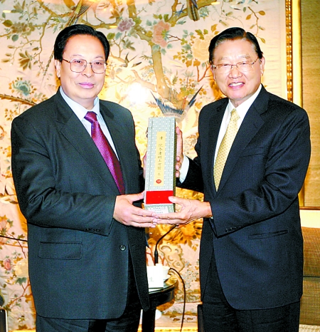 12月15日中午,江丙坤在臺北會見徐光春率領的河南省參訪團一行。記者 陳 偉 攝