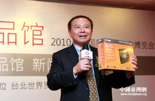 友訊科技公司執行長曹安邦向大家介紹自己公司生產的精品路由器。(中國臺灣網 鐘寶華 攝)