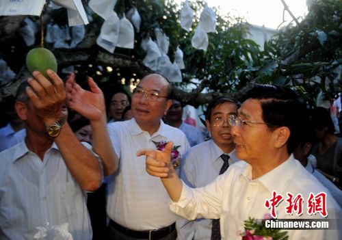 郭聲琨一行的到來受到當(dāng)?shù)孛癖姷臒崃覛g迎。果農(nóng)以一種特別的方式——燃放爆竹來歡迎遠(yuǎn)方的客人。郭聲琨抵達(dá)臺南縣南化鄉(xiāng)小侖村時(shí)已值傍晚,他深入果園,參觀豐收在望的芒果園,與果農(nóng)親切交流,了解水果產(chǎn)銷情況,并走進(jìn)集貨場,參觀貨場水果分揀,包裝作業(yè)過程,品嘗臺南水果。