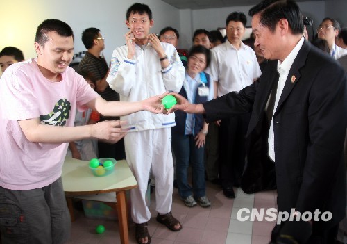 5月27日,參加“天府四川寶島行”的中共四川省委書記劉奇葆一行,來到陽明教養(yǎng)院參訪,傳遞愛心,與殘障人士親密接觸。圖為一位殘障者正在練習(xí)簡易投籃,球滾到一側(cè),劉奇葆連忙俯身撿起,遞到殘障者手上。 中新社發(fā) 鄒輝 攝